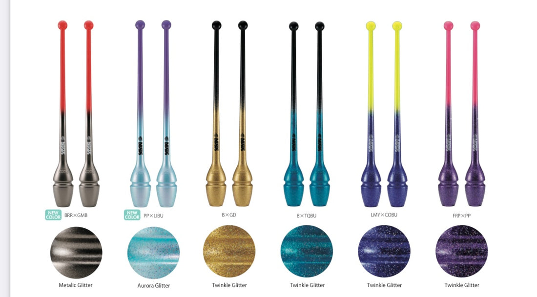 Sasaki rubber clubs for rhythmic gymnastics are perfect for beginning gymnasts: a simple and comfortable monochrome model in bright colours. A ball of one club is fixed in the head of another. Sasaki's objects are recognized as the best in the world, it is easy for them to learn new people and work for professional gymnasts - tested for years! SASAKI rubber clubs consist of a fiberglass base that gives them strength and a urethane top coating that, like the mold, reduces possibility of cracks and splits and promotes dynamic rolls during the performance. Double fixation system: easy fixing - for quick movement, strong fixation - for dynamic movement. Suitable for international competitions, complies with F.I.G. standards